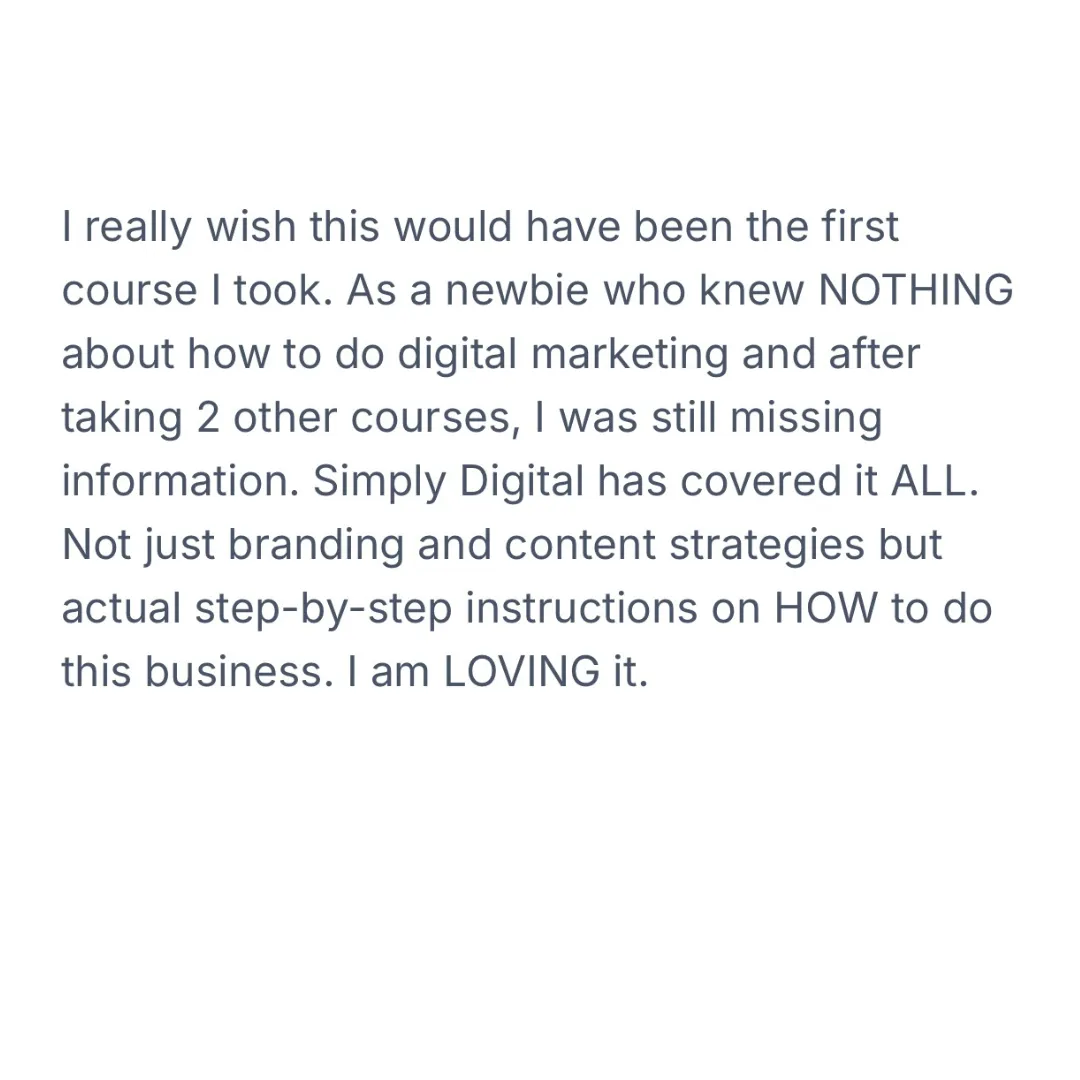 Simply Digital focuses heavily on helping you develop an effective content strategy that reflects your personality, values and goals before you ever begin to market. We have also taken a distinct approach in the way we teach, so you will quickly learn all the requisite skills and components to ACTUALLY succeed in this space! We have created a system that banishes the confusion and will not only tell you what to do, but will show you HOW step-by-step!