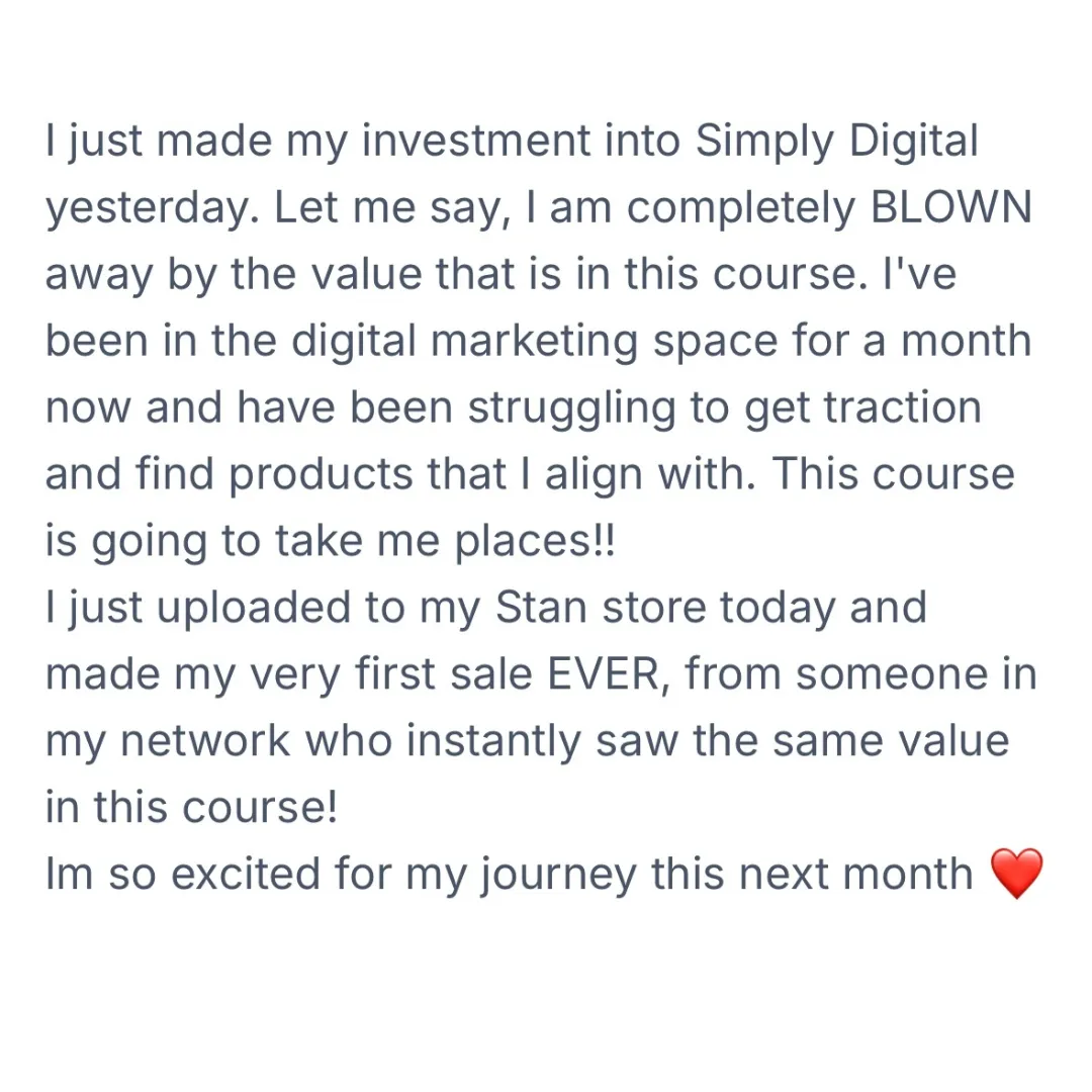 Without a doubt!!Simply Digital is an excellent resource for anyone beginning their Digital Marketing journey. The course is designed in such a way that it is easy enough for complete beginners, while also providing detailed information for those who want to master Digital Marketing. This program offers all the essential features needed to achieve success in your Digital Marketing business.